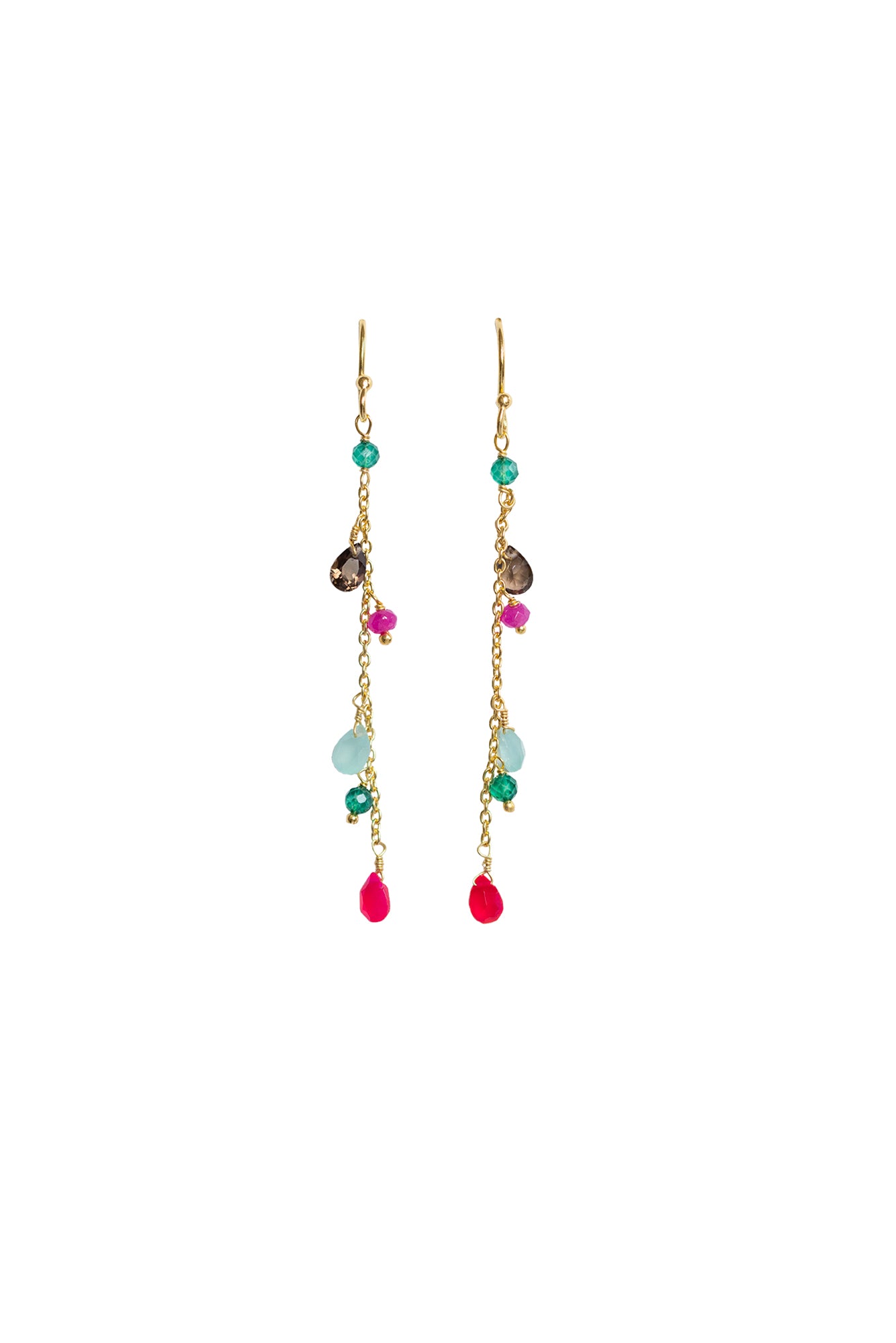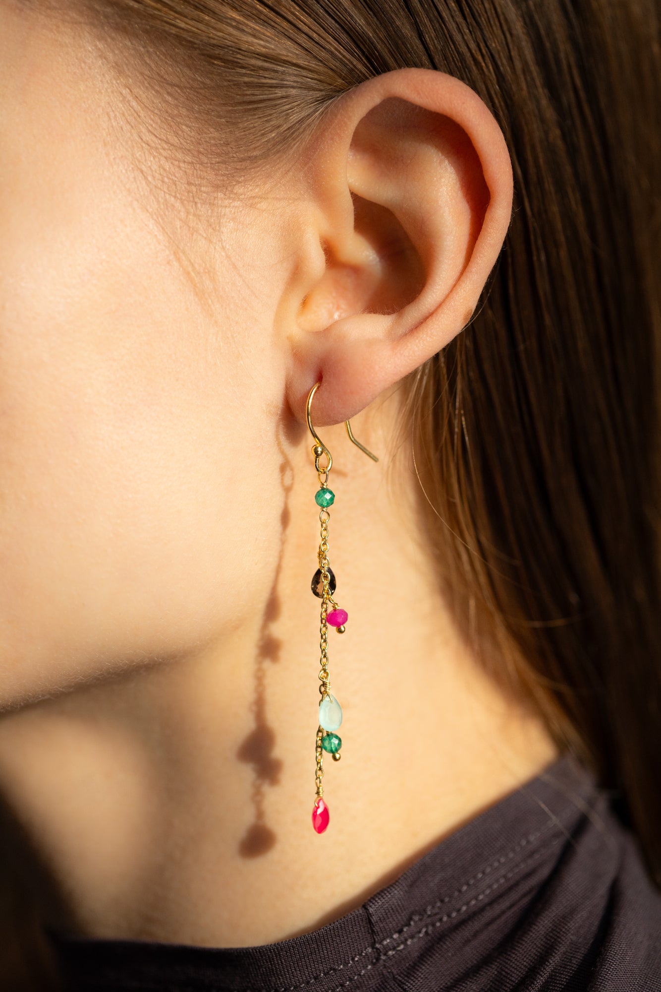 Cooler Ohrhänger mit bunten Edelsteinen in harmonischen Farben. Die zarte Kette aus Sterling Silber 24 Karat vergoldet sorgt für einen leichten, schimmernden Look- perfekt für einen Hauch von Farbe und Eleganz im Alltag oder zu besonderen Anlässen.